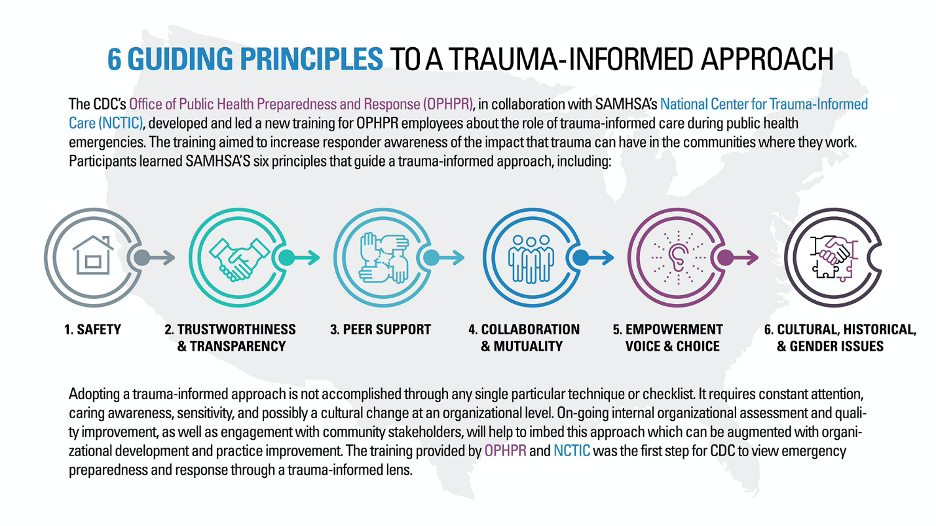 Voice and choice. Physical and emotional safety. Transparency. Culturally responsive interactions. Collaboration. Peer support. These are things we all want in our workplaces, medical interactions, and social lives, right? We also want them for our children, our parents, and our community. These factors are a part of the six guiding principles to trauma-informed approaches (TIA).