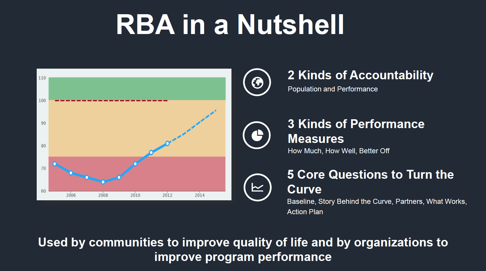 RBA starts at the end and works its way backwards. The first step is to collaboratively develop a results statement identifying the population, geography, and condition of wellbeing you want to work towards. Then, you brainstorm potential indicators—data points that measure progress at the population level. RBA includes a scoring process to select the fewest, most powerful indicators to move forward with a turn the curve activity. You graph your indicator over time and ask 5 questions to better understand the story behind the data: